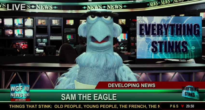 Sam appears in the 2011 Muppet movie, The Muppets, first seen as a reporter for WGF News after the Muppets broke up (before being dragged into the group's car with a cane during the montage scene), and later volunteering to take donation calls for The Muppet Telethon. He was also one of the members of the Muppet Barbershop Quartet performing Smells Like Teen Spirit.