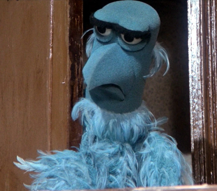 Sam gets resculpted, with the top of Sam's beak and skull being rounded and his eyebrows further trimmed, almost forming a Bert-like unibrow. His foam is being covered with a different material, with the bags under his eyes in a slightly different, more pale hue. This new puppet design begins with The Muppet Christmas Carol in a richly saturated blue. By the time of Muppet Treasure Island, some noticeable size adjustments are made; his beak becoming longer, while his hair is shorter. | |