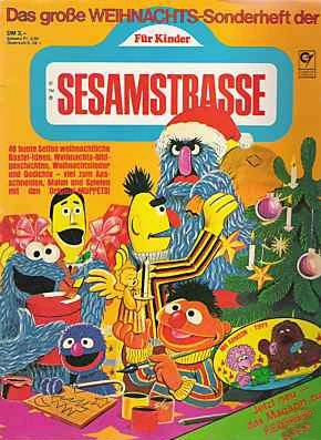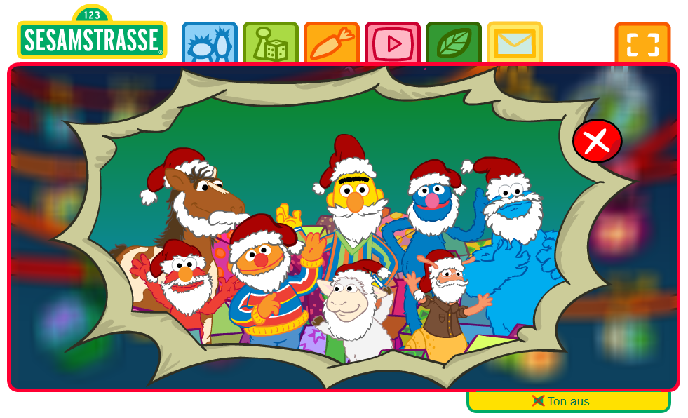 The official website's annual advent calendar features Elmo, Pferd, Ernie, Wolle, Bert, Grobi, Finchen and Krümelmonster in Santa hats and beards. |
