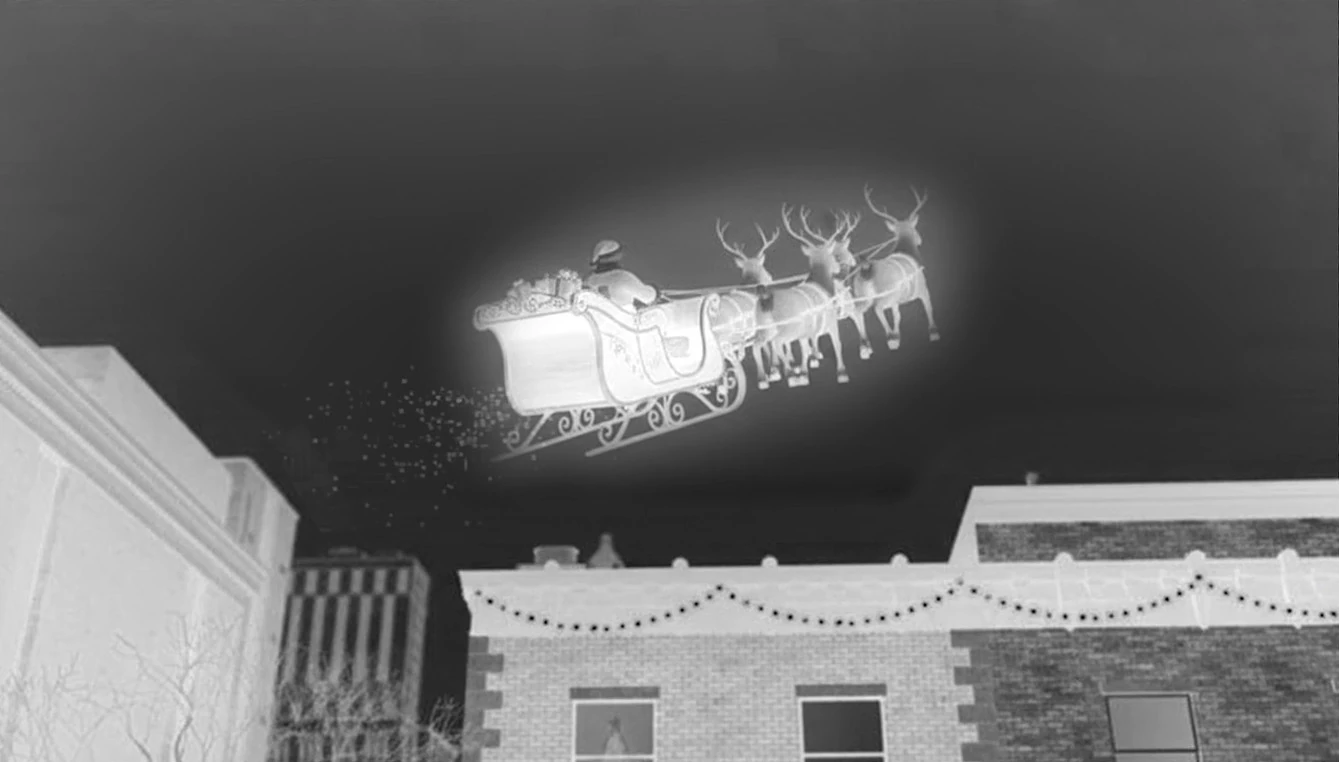 Santa Claus whizzes by, as the lyrics of the song "Good Things Happen in the Dark" mention him by name. |