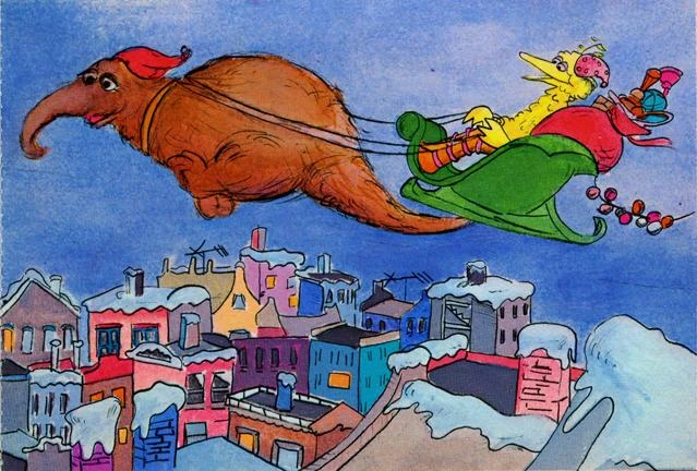 Big Bird taking on the role of Santa with Snuffy taking on the role of the reindeer. | |