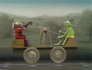 Gonzo sings "Sentimental Journey" to Kermit while they travel by hand car to the railway station during the UK Spot on episode 308 of The Muppet Show.