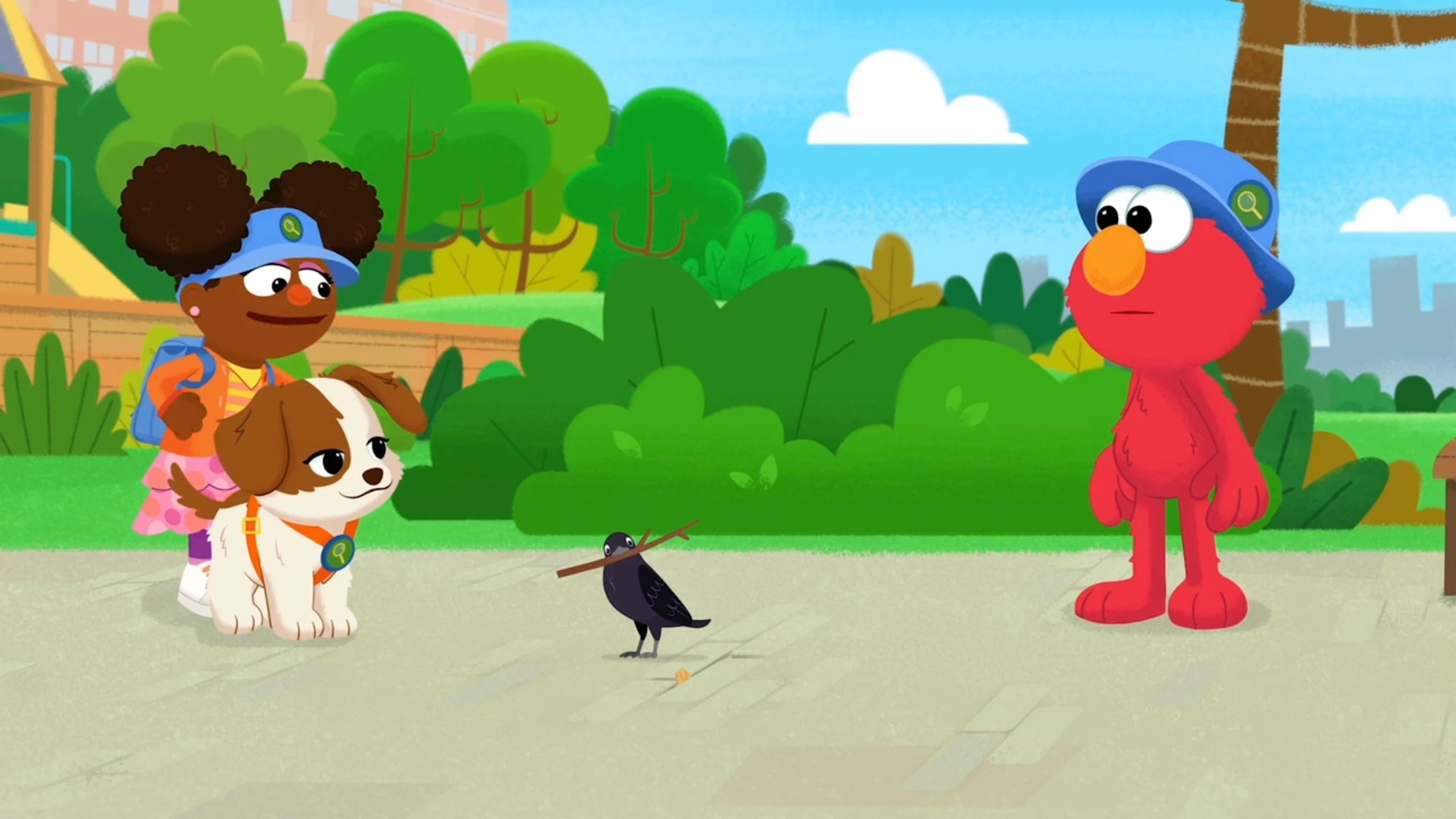 Elmo, Tango, and Gabrielle learn about the cleverness of crows. |