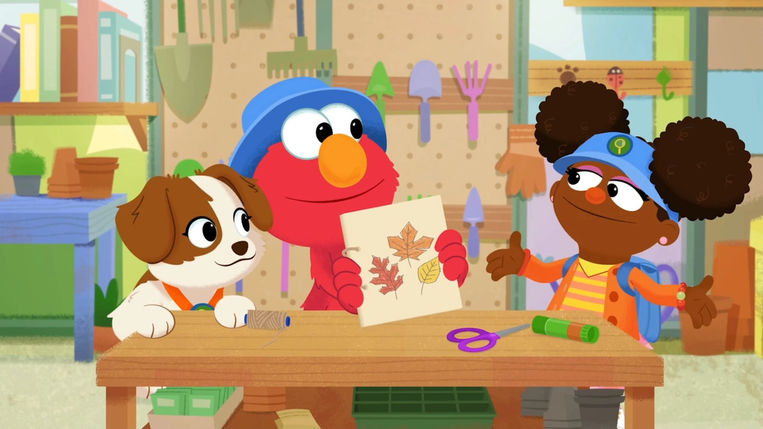 Elmo, Tango, and Gabrielle discover different types of leaves. |
