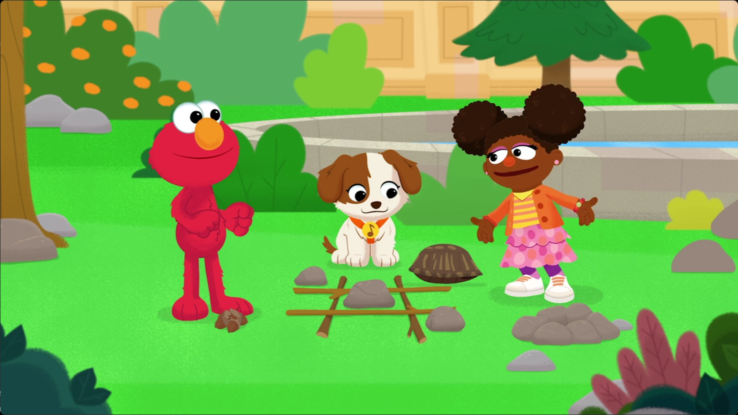 Elmo, Tango, and Gabrielle find a "rock" that keeps changing locations. |