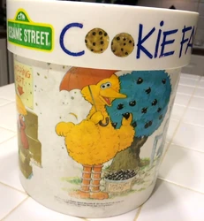 Peter Pan Industries produced a melamine Sesame Street cookie jar in the mid-1990s. The illustration on the jar, labelled "Sesame Street Cookie Factory," pictures the Sesame friends on a fanciful chocolate chip cookie production line.