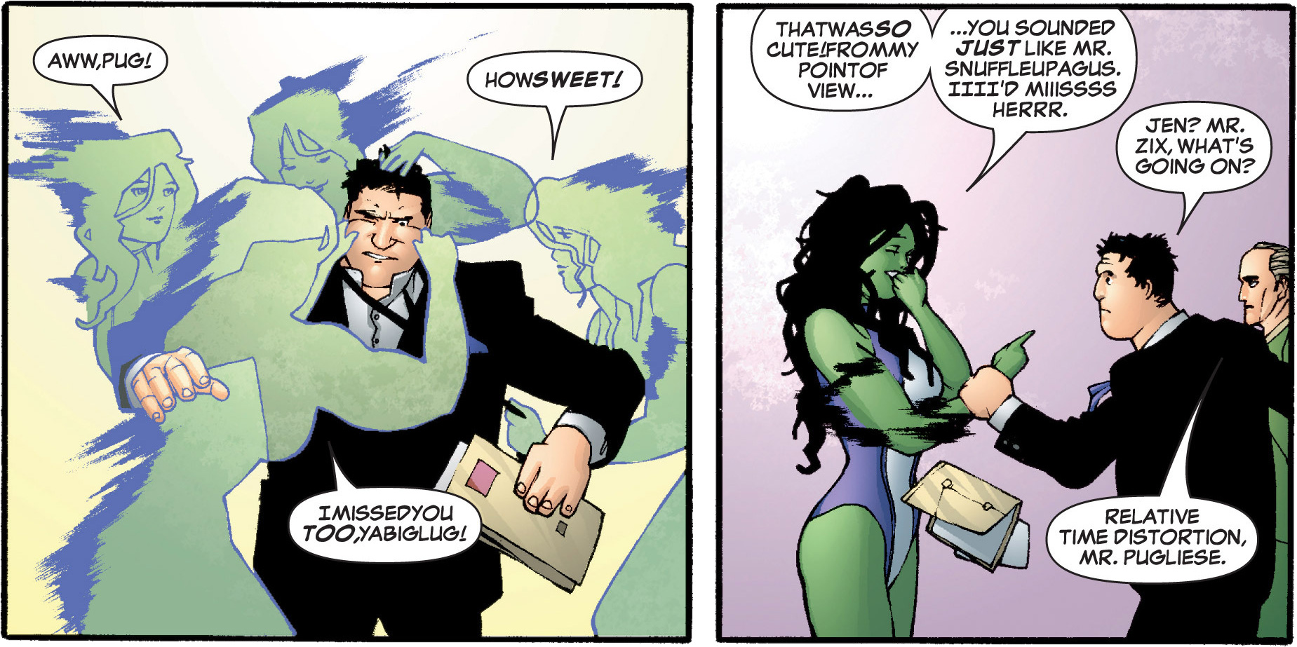 - Jennifer Walters compares legal colleague Pug to Mr. Snuffleupagus in She-Hulk v2 #5 (February 2006).
