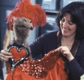 Sherry Amott with Mrs. Mink and her dress for the lost musical number in Emmet Otter's Jug-Band Christmas.