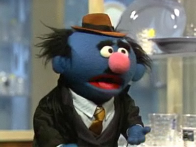 Simon Soundman wants a chicken sandwich, which he orders as a "cluck-cluck" sandwich. Waiter Grover has trouble figuring out what his customer wants. When Grover finally understands, Simon changes his mind. He now wants a hot dog, but he makes dog's sounds instead of saying "dog", confusing Grover again. | ||