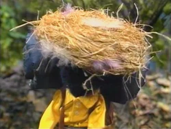 FRAME 5 | The group observes a nest being built by two birds, who reuse string as part of it. Grover calls the process "reusing something old to make something new," otherwise known as "recycling." The male bird then swoops down and takes Grover’s hat for their nest. They give him their old nest to wear in its place. |