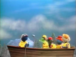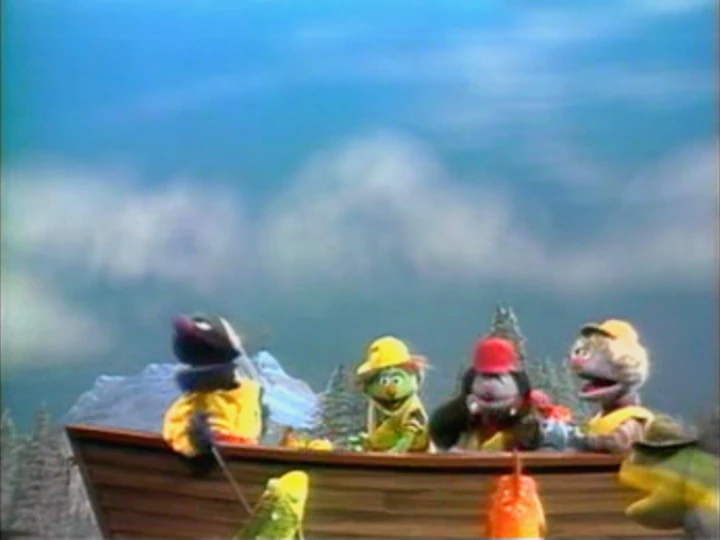FRAME 3 | The campers sit in a rowboat in the nearby lake, when Junior tosses his trash into the water. Smokey the Salmon emerges from the water and tells them not to throw trash into the lake. Grover assures Smokey they will dispose of the trash properly, and Smokey and his fish friends toss more water pollution for them to take as well. |