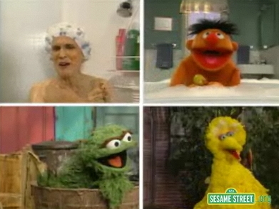 "Singing in the Shower" is a Sesame Street song where Olivia, Ernie, Big Bird, and Oscar sing about how they like to sing in their various modes of cleaning (shower, bathtub, birdbath, and mudbath, respectively.)