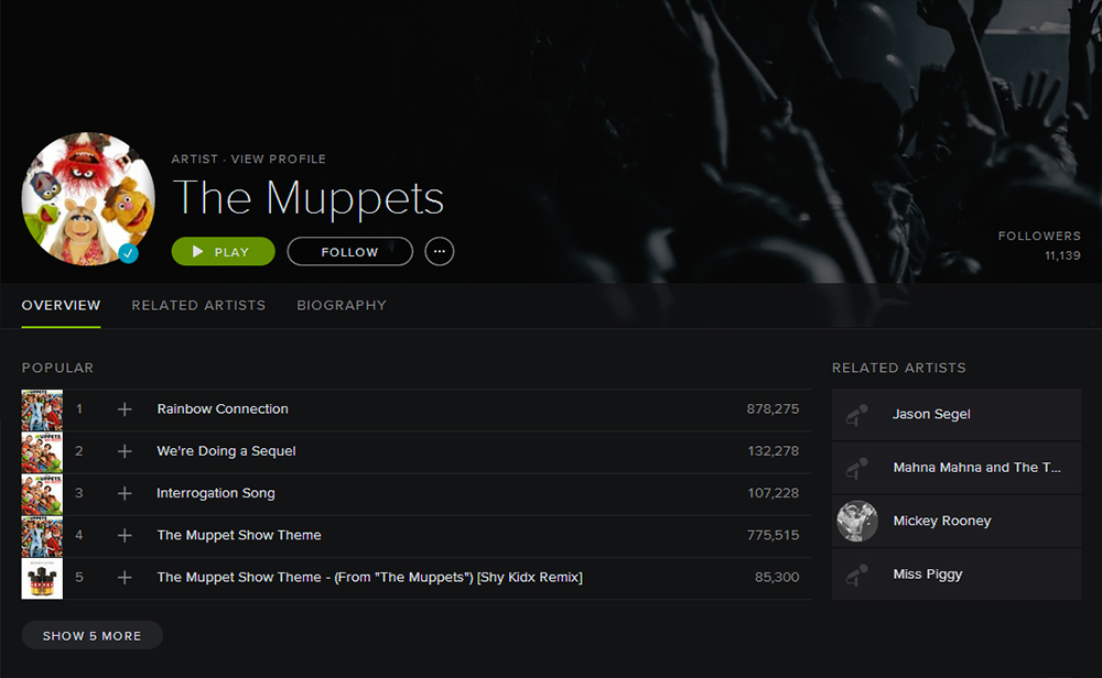 In March 2014, four character-based playlists were created in promotion with the movie Muppets Most Wanted.