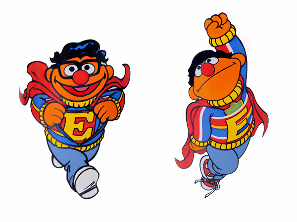Sesamstrasse Merchandise | Ernie has appeared on Sesamstrasse glassware and Sesamstrasse postcards as a superhero with a secret identity wearing Clark Kent-like glasses. |