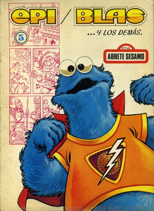 Epi, Blas y los demΓ‘s (1970s) | Cookie Monster's superhero persona graces the cover of an Epi, Blas y los demΓ‘s comic book from the 1970s. |