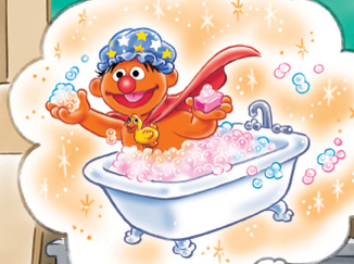 We're All Superheroes! | Ernie is imagined as Bubble Man who rub-a-dub-dubs in the bathtub until he's squeaky clean. |