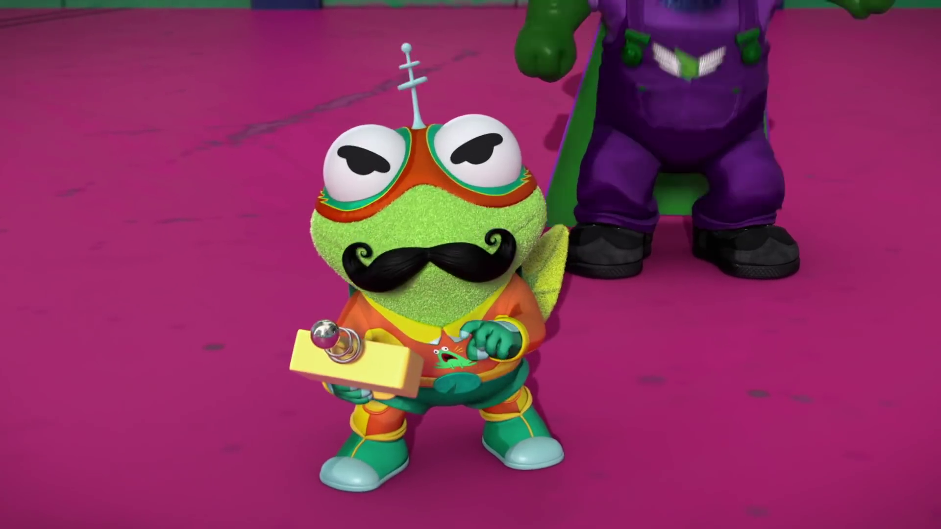 Baby Kermit takes the role of caped superhero The Froginizer. He protects Muppetopolis utilizing his super listening power. At other times, Kermit plays the role of Commissioner Kermit. In "Rise of the Pickler," it is revealed that he resides within the Fortress of Frog-I-Tude. The character appears to be based off of a fictional comic book character on the show. |