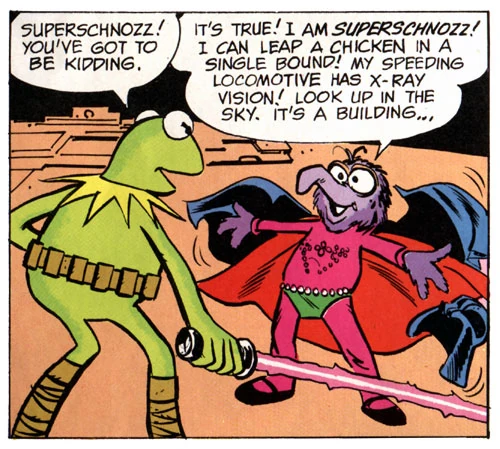 Baby Fozzie regularly assumes the role of villain henchman The Noodler. He provides Dr. Meanzo with a cage for the superheroes, made entirely of noodles. |