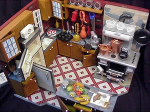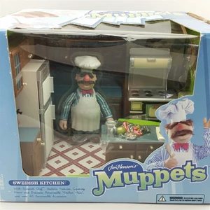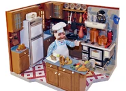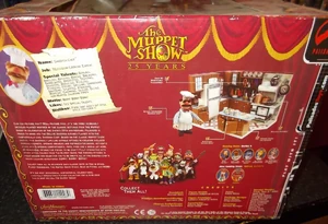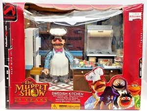 The Swedish Chef's kitchen was the third playset released by Palisades Toys in honor of The Muppet Show's 25th anniversary. This playset had the most accessories and features, including cupboards with opening doors and drawers, a refrigerator and a stove with many working doors, and a telephone.