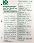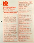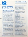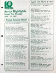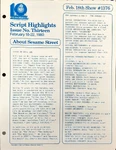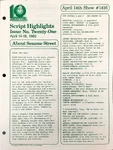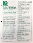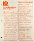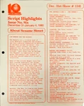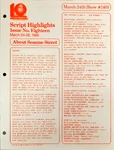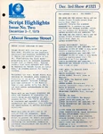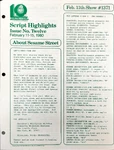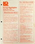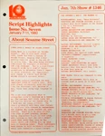 This is the main treasure trove of episode information. CTW wrote summaries for individual episodes, and sent them to educators and parents who wanted to plan educational activities to tie in with each day's Sesame episode. These were called "Program Packages" for a while, and then "Script Highlights". The archives have them in Box 52, folders 8-18.