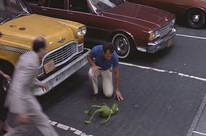 The word "Taxi" can itself be used for transportation, as a surprised Kermit the Frog discovers during a lecture. His encounters with cabs were not always so fortunate, however. A New York taxi hits Kermit in The Muppets Take Manhattan. The driver does stop to render assistance to the stricken frog, but the vehicular incident leads to a case of amnesia.