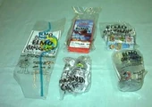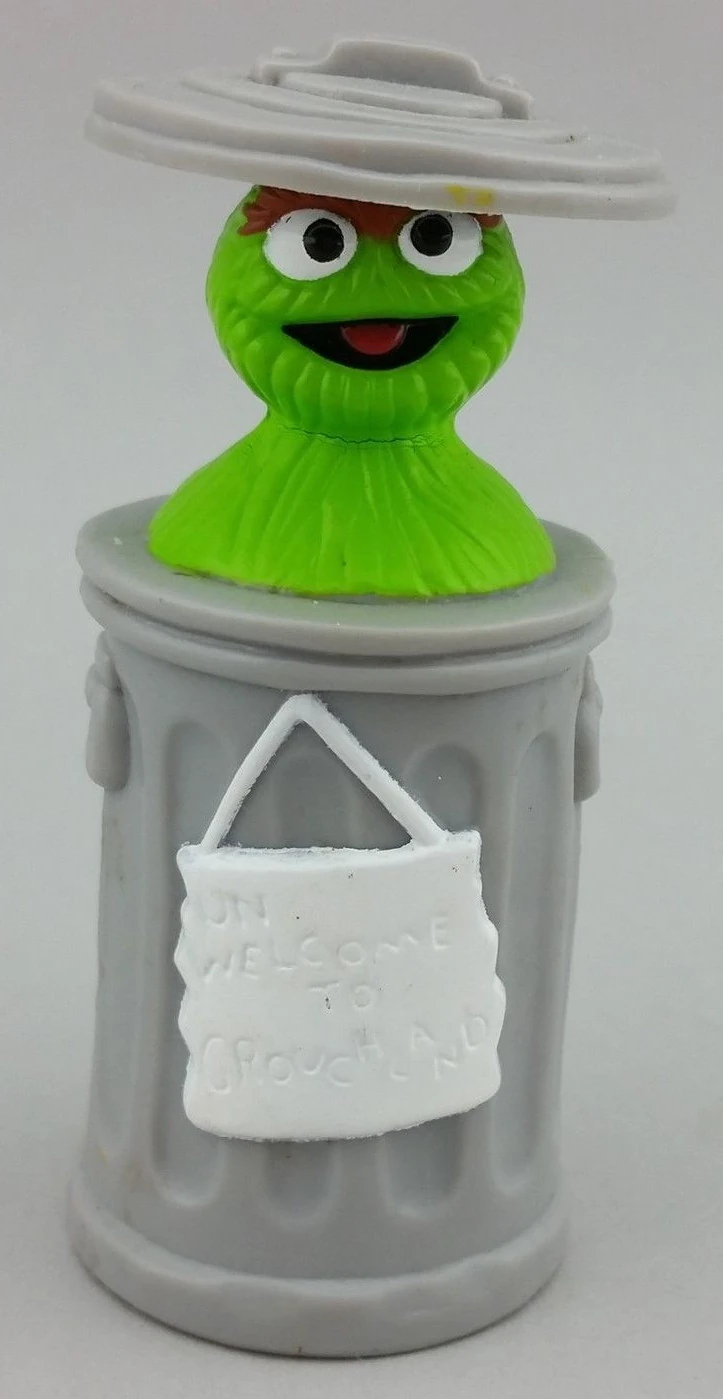 The set of five toys included a plastic see-through cup with Elmo inside the cup, a tall Cookie Monster straw, a PVC figure of Oscar the Grouch in his trash can, a puzzle of the video cover, and a twist block with four Muppet characters.