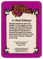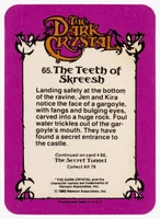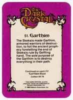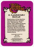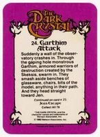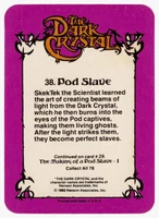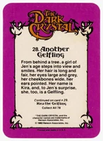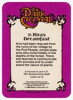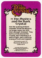 Donruss released a set of 78 trading cards based on The Dark Crystal in 1982. Originally sold in packs of 8 cards (via boxes of 36 packs), each card features a picture on the front and part of the story of The Dark Crystal on the back (collecting all the cards will provide the whole story).