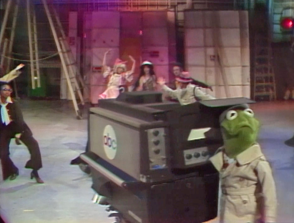 Kermit reacts to the characters of The Electric Company during the opening number of Out to Lunch.