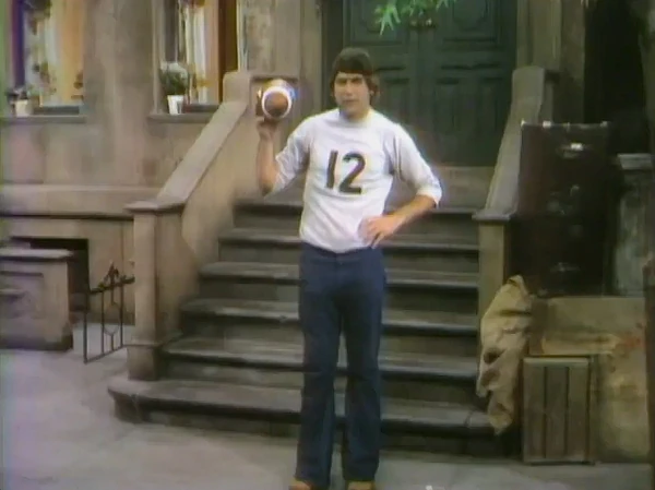 Joe Namath, on the Sesame Street set, reads the word "pass" on his football in The Electric Company.