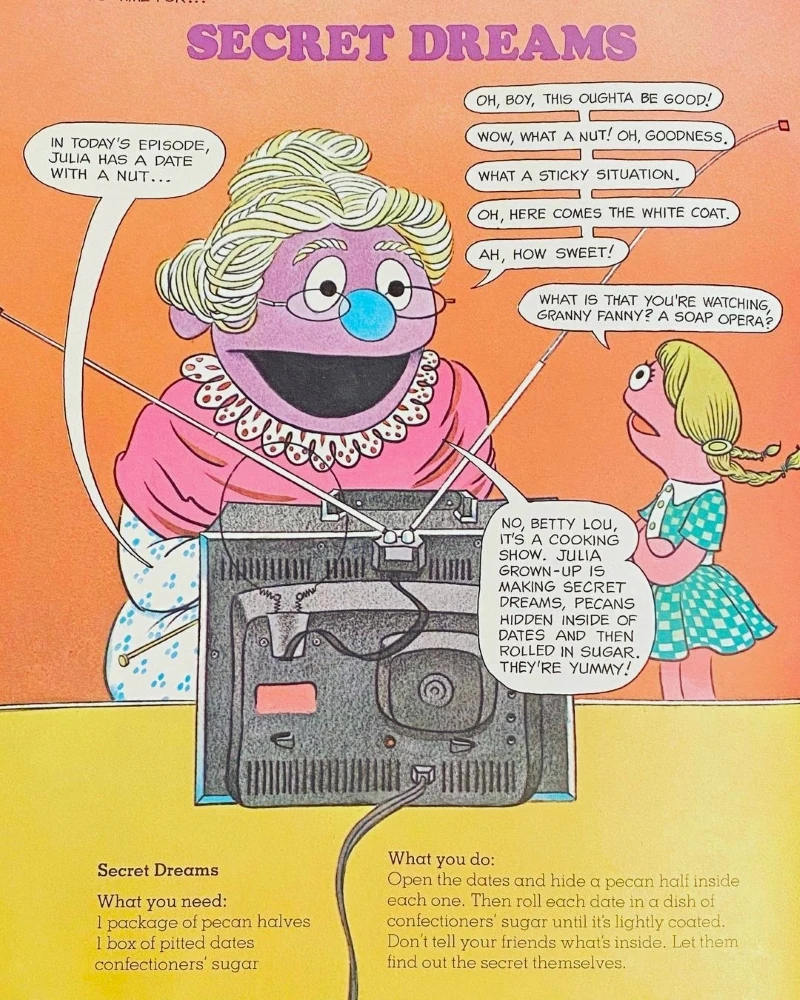 - In The Sesame Street Cookbook, Granny Fanny Nesselrode is watching a cooking show hosted by Electric Company character Julia Grownup.