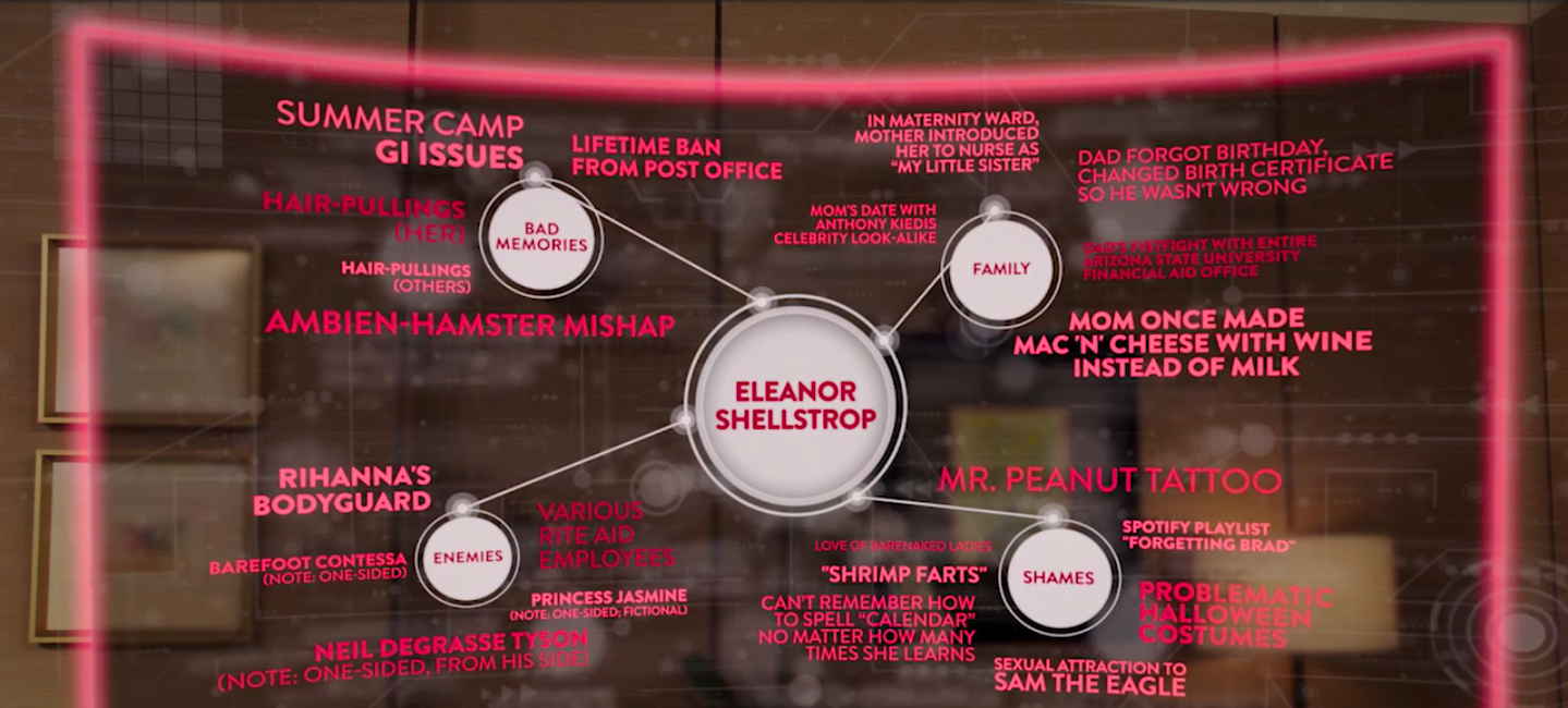 - In the season three episode "The Worst Possible Use of Free Will," Michael mentions (in a flashback) that Eleanor has sexual fantasies involving Sam the Eagle; this is also shown on the page of her file he shows her immediately beforehand. She justifies it: "He’s very authoritative, and I find that reassuring."