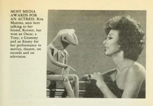 - A photo of Kermit the Frog and Rita Moreno from The Muppet Show episode 105 appears in the 1982 edition to represent Moreno's record for "Most Media Awards for an Actress" (she won her Emmy for her appearance on the show).