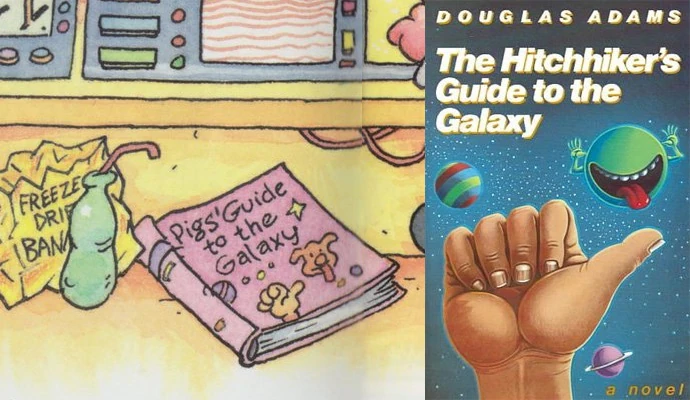 - Larry DiFiori, in illustrating the 1997 book Pigs in Space: Journey to the Planet Za, littered the floor of the Swinetrek Too with various bits of paraphernalia, including a book called "Pigs' Guide to the Galaxy." The book's cover features a hitchhiking thumb and face with tongue sticking out in reference to the cover of The Hitchhiker's Guide to the Galaxy illustrated by Peter Cross.