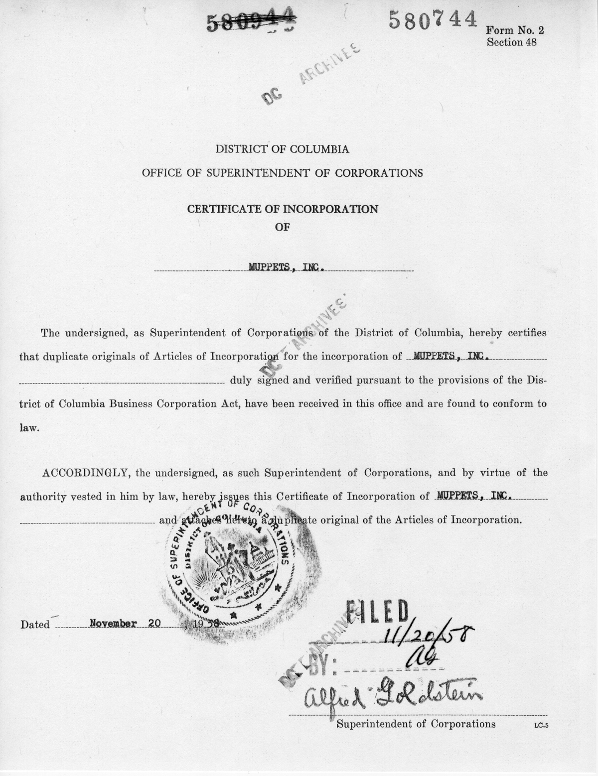 According to documents retrieved from the District of Columbia Archives, Articles of Incorporation for Muppets, Inc. were filed September 10, 1958 in Washington, D.C. by agents acting for Jim Henson and Jane Nebel. The Certificate of Incorporation was granted November 20th of that year. Not until the corporation filed its first annual report in 1959 did the names of Jim Henson and Jane Nebel appear in the city's archives.