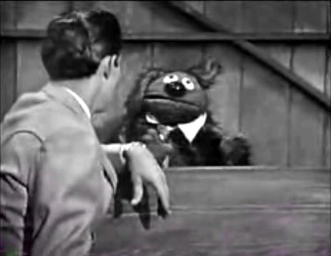 When Jimmy Dean shows his set off to the audience, Rowlf pops up behind his usual bench and excitedly asks if Lassie has arrived yet. He resents Jimmy's quip that she took a Greyhound to get there.