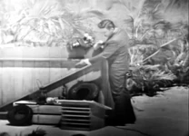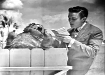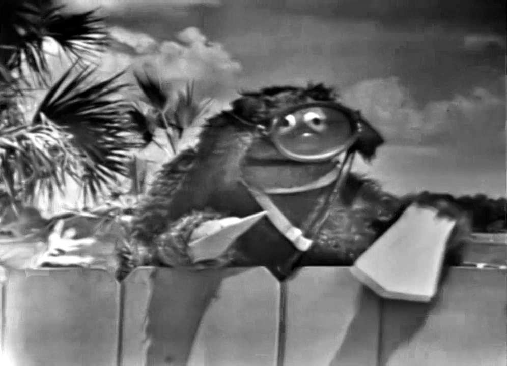 Later, Jimmy informs the audience that Rowlf has spent virtually the entire trip thus far on a treasure hunt. Rowlf emerges from behind the fence in scuba gear ("You remember me, the Creature from the Black Lagoon?") Rowlf tells Jimmy that he's been diving into the lake to look for sunken treasure and re-emerges with a propeller. Jimmy points to all the sundry items Rowlf has already found and tells him that they're all junk, not treasure.