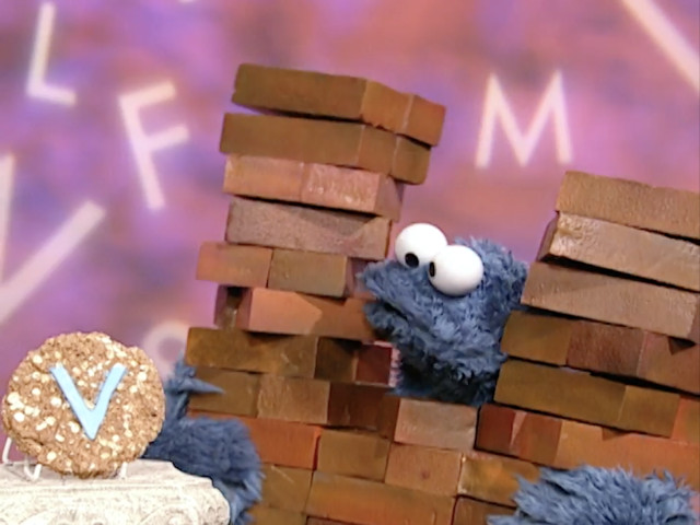 Episode 3987 | V - Bricks Cookie Monster carries a heavy load of bricks in an effort to not eat the letter V cookie. However, after he falls down, he eats it anyways. | ||