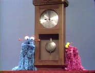The Martians discover a grandfather clock and wonder if it's an Earth person. They consult their book, which says a person is tall, has a face, and has hands. The clock fits the description perfectly. But then the grandfather clock begins chiming the hour, frightening the Martians.
