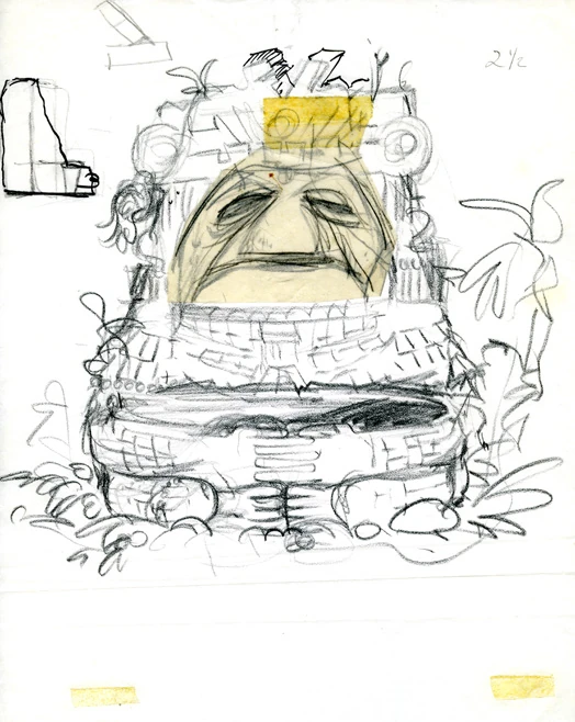 In this concept sketch of the Mighty Favog, Michael K. Frith has drawn the body and Jim Henson has drawn the character's face.