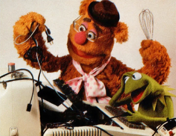 A photo of Fozzie and Kermit taking apart a computer to promote the Henson Company's partnership with Starwave, published in the Nov 1994 issue of Electronic Entertainment.