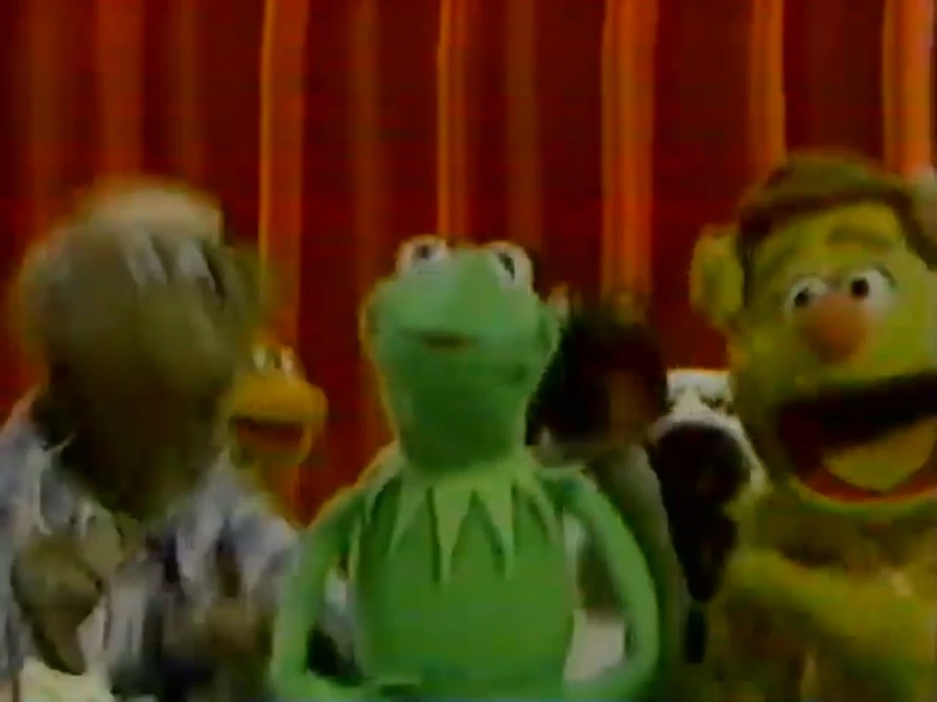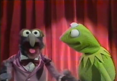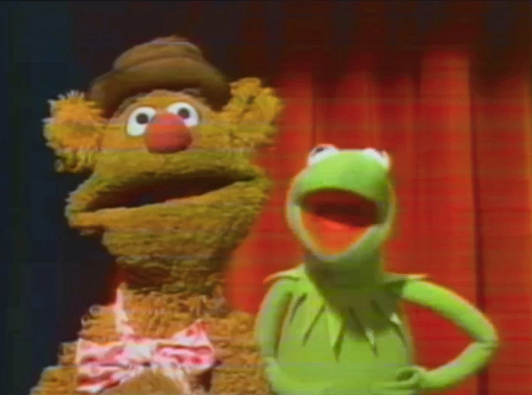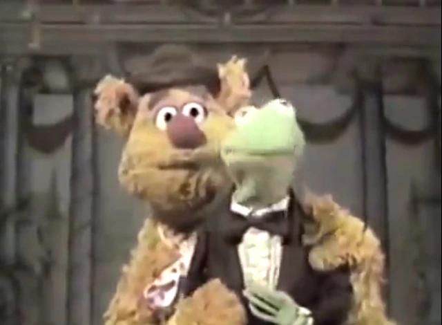 Fozzie is standing in front of Kermit onstage and mimes to Kermit's voice. A clip of Liberace dancing with Fletcher Bird is shown. Both shots are extended from what appears in the episode (which cuts to Statler and Waldorf here). |