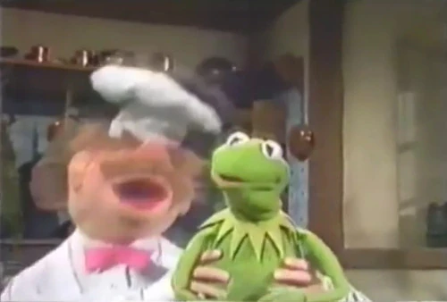 The Swedish Chef is dancing around Kermit in The Swedish Chef's kitchen. A clip of "Grocery Blues" is shown. |
