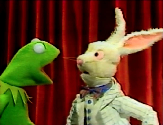 In the 30 second promo, Kermit introduces a scene from "Falling Song" (sans laughter track and slightly extended) while The White Rabbit hops by in the background. He finally stops and Kermit tells him he's late. The 10 second promo features the two, as the Rabbit hops wildly. Kermit joins, falling down the rabbit hole. |
