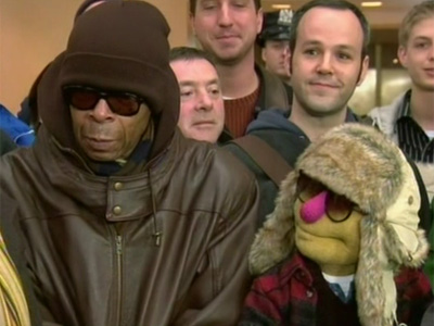 A yellow Whatnot, which Meredith suggested was a caricature of Linny Boyette (a frequent audience member on the plaza), appears behind the barricades. Meredith mentions her tradition of kissing Linny as being the first thing she does on entering the plaza, and proceeds to kiss him and then the Muppet.