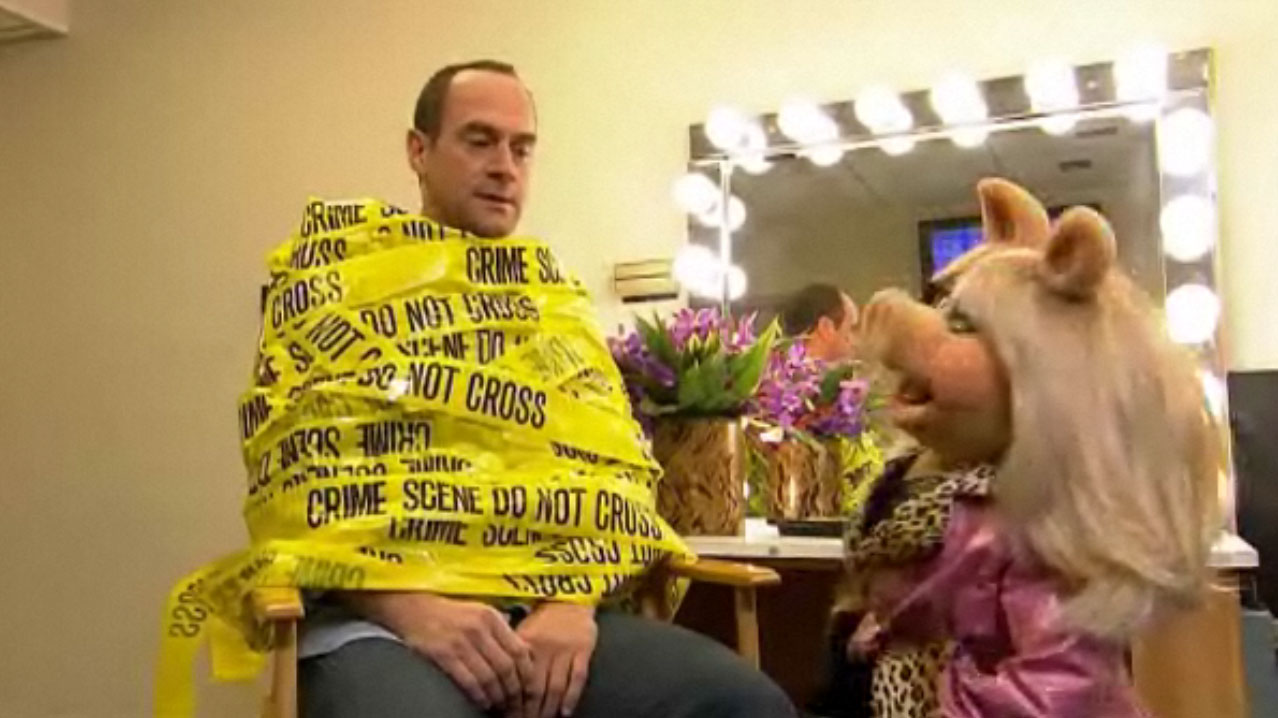 The Muppet hosts do a teaser for Christopher Meloni (Law and Order: SVU) and Miss Piggy (Law and Order: E-I-E-I-O). Cut to a dressing room, where Meloni says he's glad to meet her, but unsure why the two of them would be on together to discuss relationships; Piggy tells Meloni about how she feels he lusts over her. Cut back to the Muppet hosts, unsure what's taking Meloni and Piggy so long. Cut back to Piggy, who has wrapped Meloni in crime scene tape. Cut to the actual hosts, including Al, who tackles Bobo so they can enter the studio. Cut back to the Muppet hosts, who tease Connick's segment, and throw to break.