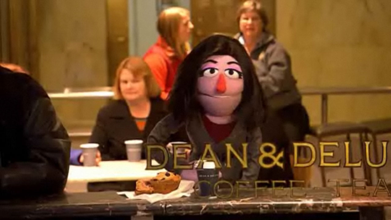 Back in New York, the real Matt, Meredith and Al argue with Bobo the bear, who is working security. Bobo reads Matt's personal ID, asking "Is this your current address, Mr. Lawyer?" The hosts correct him, saying "Lauer". Hearing their correction as "Louder," Bobo continues to mispronounce the name in a progressively louder voice, until cracking at them. In Studio 1A, the set of the show, the Muppet hosts throw to Muppet Ann, who is supposed to be in a "far flung" place, for their Ends of the Earth series on Today. Muppet Ann is in Dean & Deluca Coffee and Tea, a shop visible from the Today plaza. She explains that Bobo told her that Linny needed a pumpkin spice latte. Bill Barretta and Craig Shemin are sitting at the same table at the store.