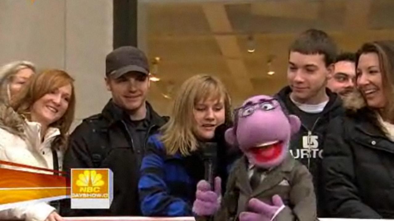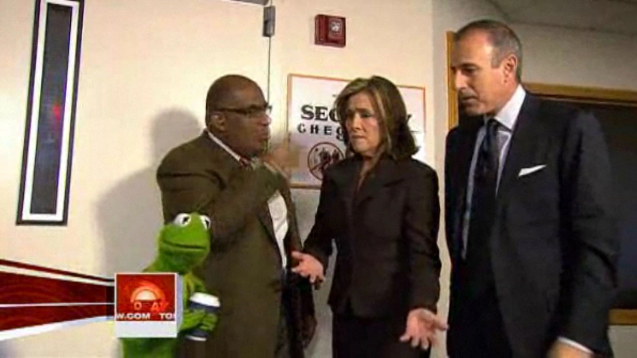 As the Muppet half hour begins, while Matt Lauer, Al Roker, and Meredith Vieira pound on the door to be let back on, the camera cuts to Muppet Meredith and Muppet Matt on the couch, mentioning what's coming up on the broadcast, including two of Washington, DC's leading political pundits giving their take on President-elect Barack Obama's cabinet picks, Christopher Meloni discussing how he makes his work relationships work on- and off-the-job, and Harry Connick Jr. is set to play a song from his Christmas album. They then throw to news, after which Lester Holt (filling in for Ann Curry) throws to Al for the weather. Muppet Al asks an audience member where they're from, asking "What's your name, ma'am?", then stating "That's a great name", without giving her time to talk. He throws to local weather. Afterwards, Muppet Willard presents the Smuckers 100th birthdays, with pictures of four Muppets.