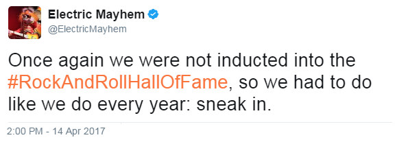 - In April 2017, The Electric Mayhem tweeted: "Once again we were not inducted into the #RockAndRollHallOfFame, so we had to do like we do every year: sneak in." (view tweet)