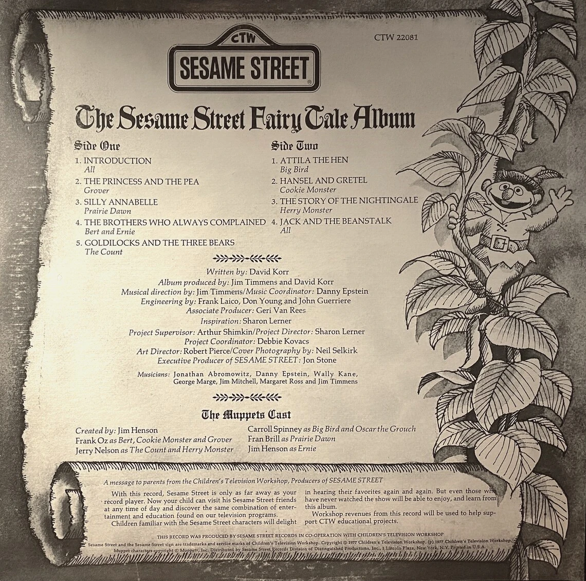 The Sesame Street Fairy Tale Album features Big Bird, Bert, Ernie, Prairie Dawn, Cookie Monster, Oscar the Grouch, Grover, Herry Monster and The Count sharing their favorite fairy tales. This album was nominated for a Grammy Award for Best Recording for Children, but lost to Aren't You Glad You're You?.