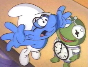Brainy Smurf and Baby Kermit as an alarm clock in Cartoon All-Stars to the Rescue